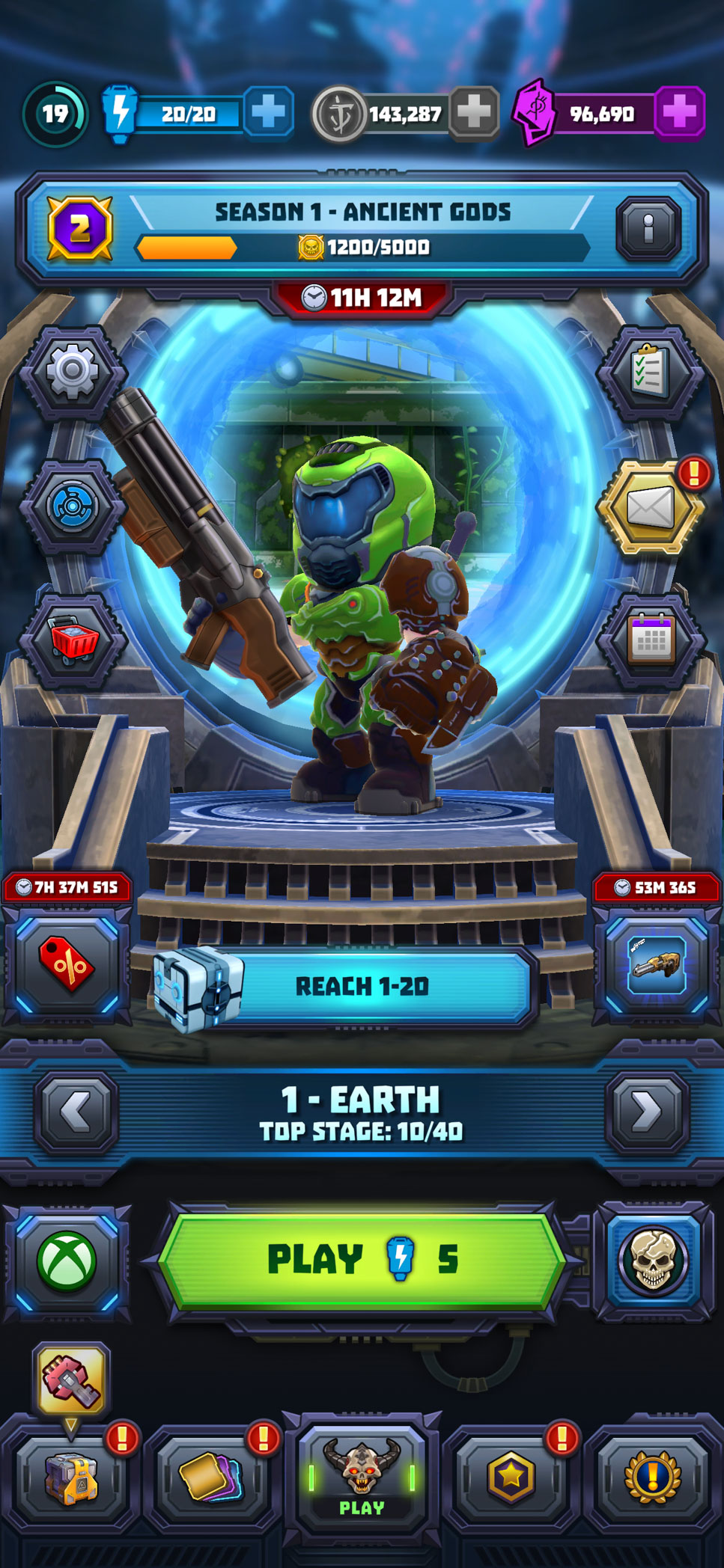 I also designed and implemented motion treatments for the Mighty Doom main launch screen, specifically to draw attention to high-value actions like Battle Pass progression and Daily Reward collection. Using Unity’s animation tools, I created subtle button animations such as pulsing scale, light-sweep passes, and brief idle motion loops to indicate that rewards were available and encourage players to press them. These animations were intentionally short and lightweight to avoid visual fatigue, and were delivered as production-ready Unity animation files that engineers could drop directly into the release build with minimal additional setup.