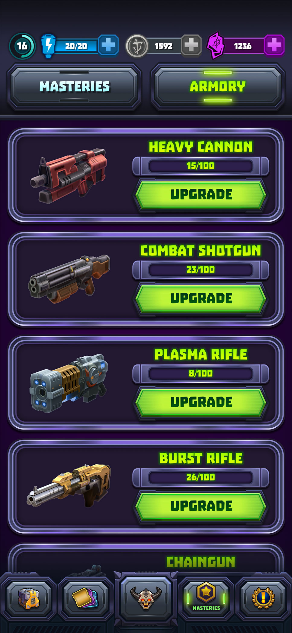 As part of my end-to-end ownership of UI/UX on Mighty Doom, I designed and animated a wide range of motion treatments that support core gameplay systems, reinforce player feedback, and highlight monetization moments in an engaging and on-brand way. All animations were created directly in Unity, and my production-ready animation files were used in the release build, greatly reducing engineering implementation time. These included a microtransaction sale promo for the Weapon Fusion feature that uses motion and particle bursts to draw attention without feeling intrusive; a weapon unlock sequence that combines anticipation-building timing with a clean burst-reveal to make the moment feel rewarding and drive retention; and an armory upgrade complete animation that reinforces progression through short, satisfying motion loops and light-sweep accents to communicate completion and polish. Across all motion treatments, I balanced clarity with visual delight, ensuring animations are performant on mobile, aligned to the DOOM aesthetic, and enhance usability rather than distract from gameplay.