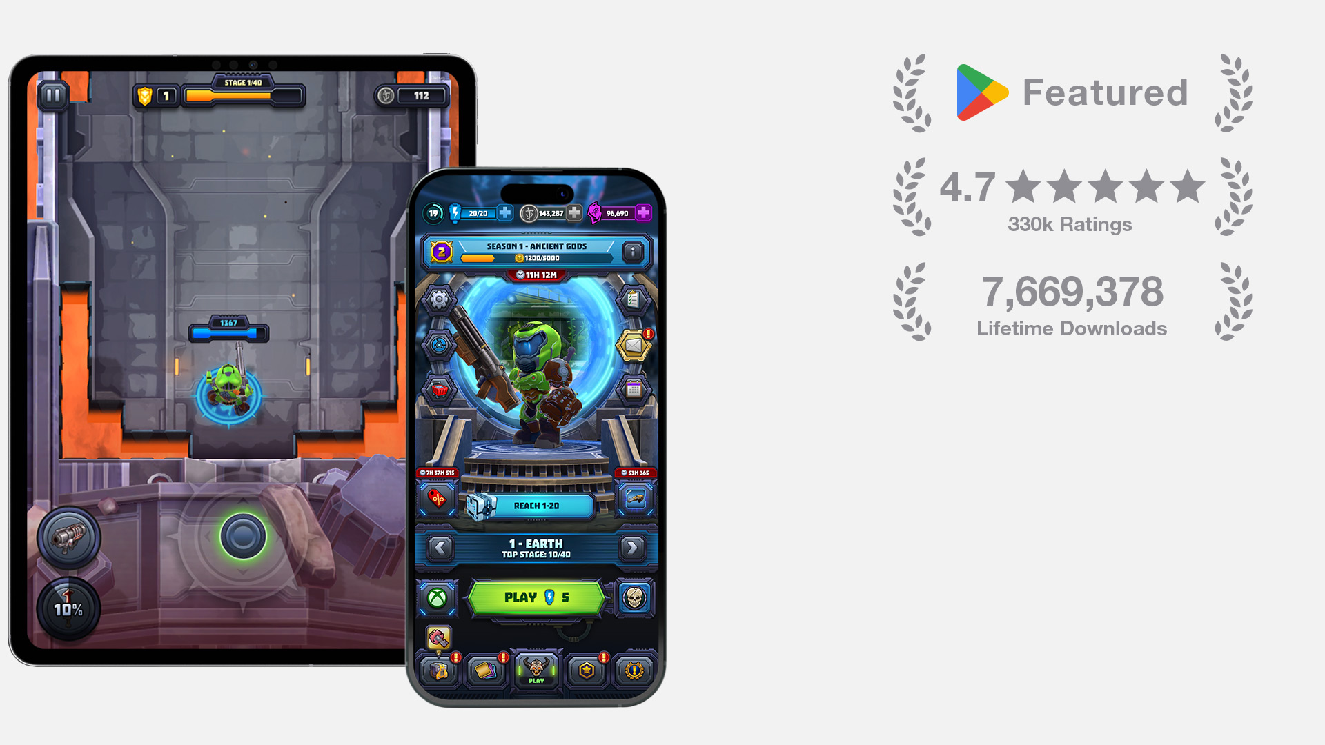 Lead UI/UX Designer for Mighty Doom, a free-to-play mobile action title with 7.6M+ lifetime downloads and a 4.7★ Google Play rating from 330k+ reviews, through my company, Vincent Chan Designs Inc. I led the end-to-end development of the game’s UI/UX, creating the UI/UX for every feature in the game and collaborating with producers, designers, and engineers to define requirements for each feature and ensure alignment with gameplay goals and monetization strategies.